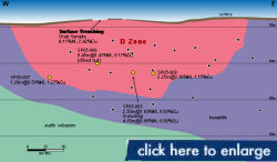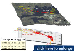 In late 2005, a short 4-hole diamond drill program on the D Zone Ni-Cu Prospect located approximately 1,500 meters along strike of the past producing Shebandowan Mine. Drill results included 4.55 meters of 3.00% Ni and 0.90% Cu from hole SP-05-005 and 2.25 meters of 3.36% Ni and 1.15% Cu from hole SP-05-008.